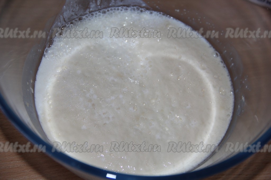 Как только на поверхности воды появятся пышные пузыри, влить в опару тёплый кефир (температура кефира тоже не должна быть выше 40 градусов, я в течение 20 секунд подогрела кефир в микроволновке), перемешать.