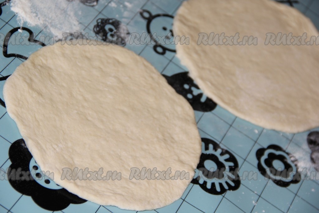 Раскатать тесто в круглую лепёшку толщиной, примерно, 1 сантиметр.