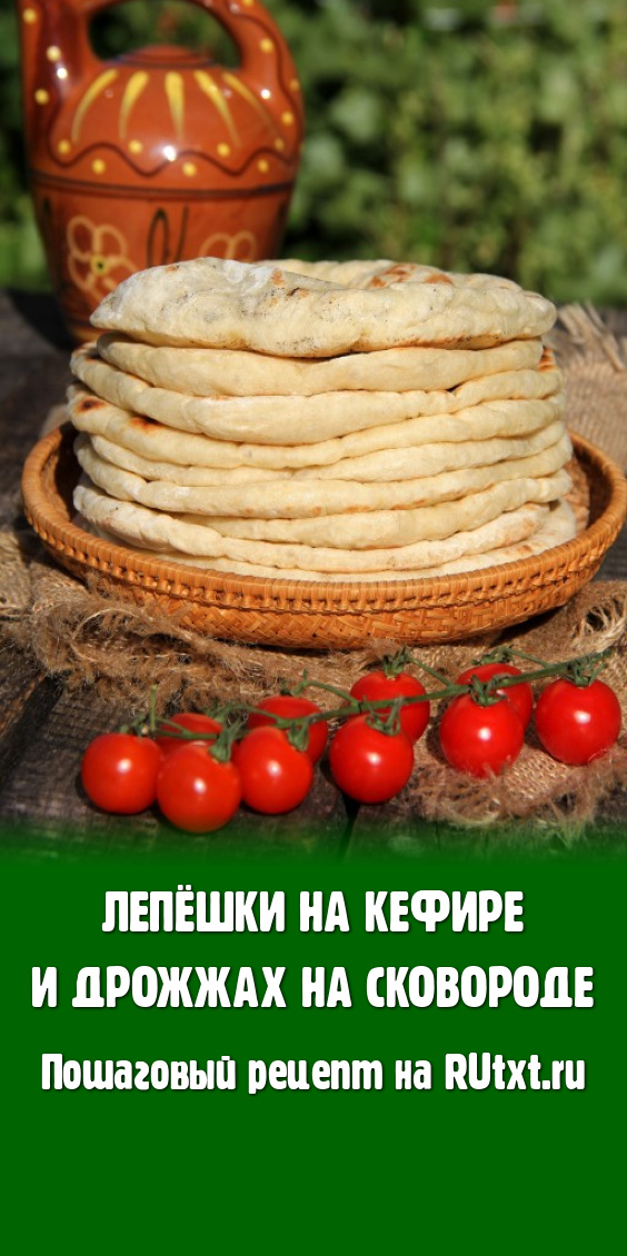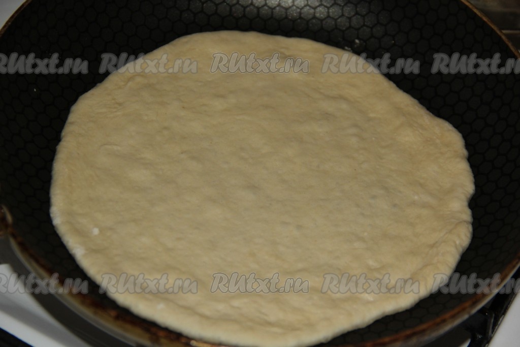 Сухую (без масла) сковороду хорошо разогреть, огонь уменьшить до среднего, выложить лепёшку, замешанную на кефире и дрожжах.