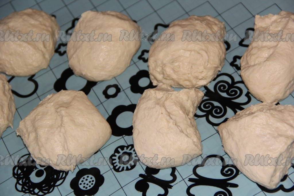 Смазать руки растительным маслом и обмять тесто. Выложить его на поверхность, присыпанную мукой, и разделить на 10 частей.