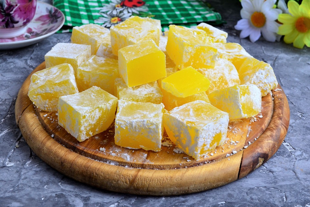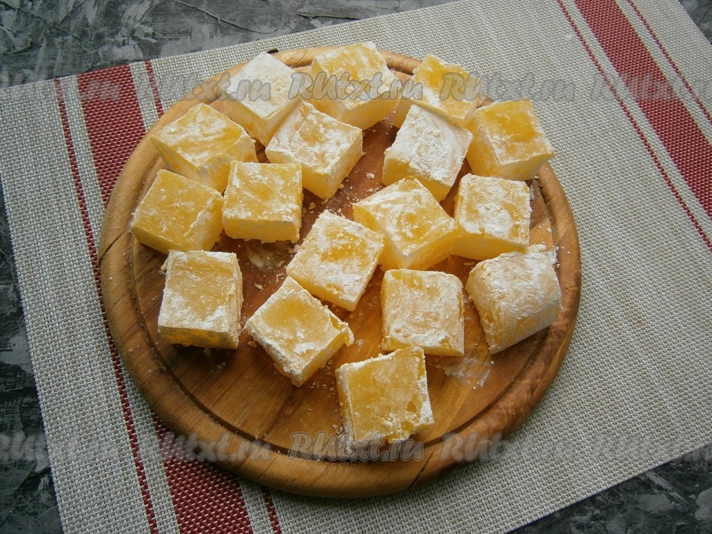 Свежий рахат-лукум, приготовленный в домашних условиях из апельсинового сока, получается мягким, похожим на крепкое желе. Чтобы он стал суше и более жестким, его нужно подсушить при комнатной температуре около 2-х дней.