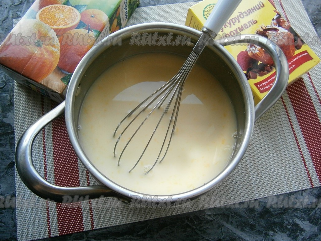 Перемешать сок, воду и сахар, всыпать кукурузный крахмал.