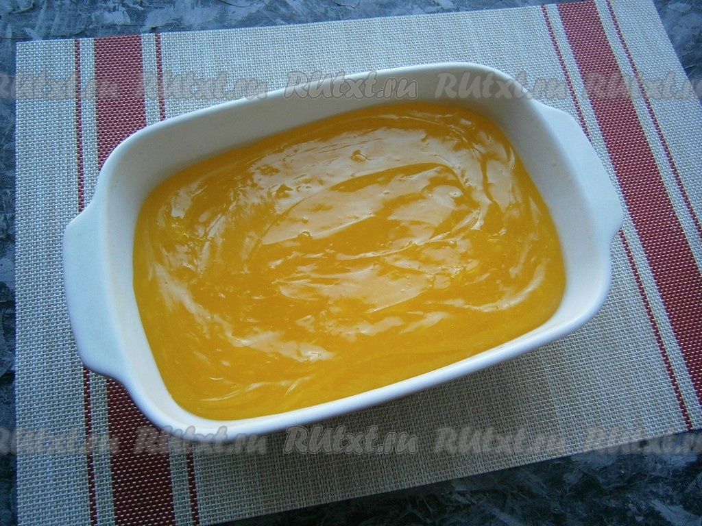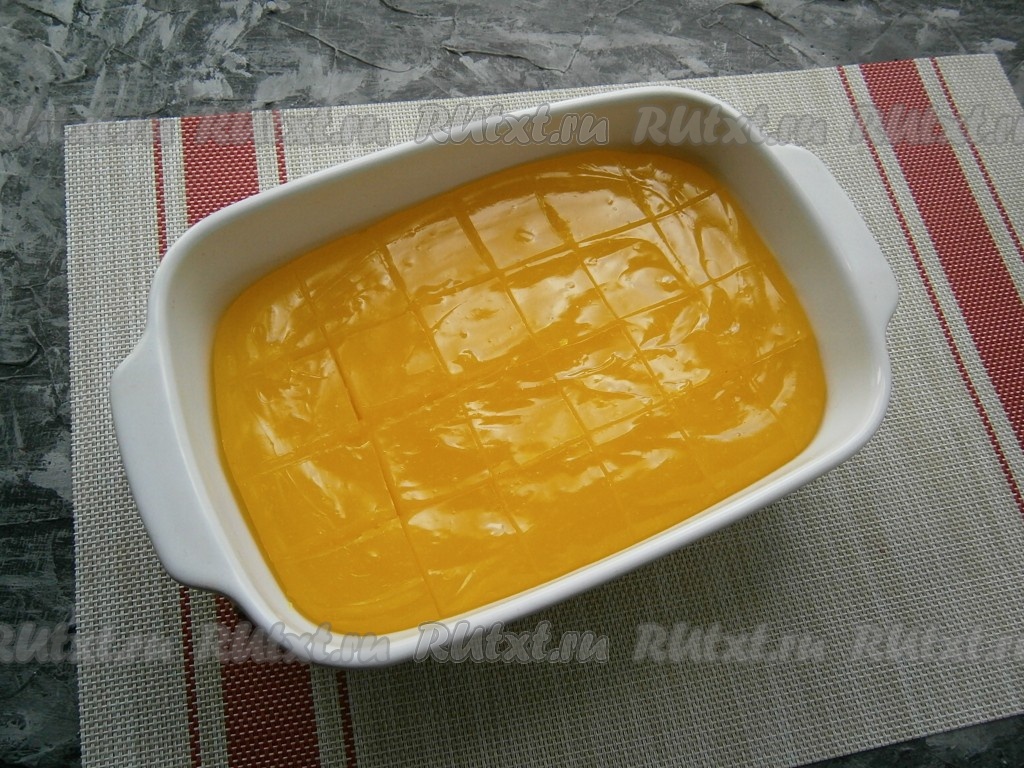 Сразу же (быстро застывает) переложить массу в любую стеклянную (или фарфоровую, или керамическую) форму, которую предварительно сбрызнуть водой. Разровнять массу. Форму желательно брать прямоугольную или квадратную.