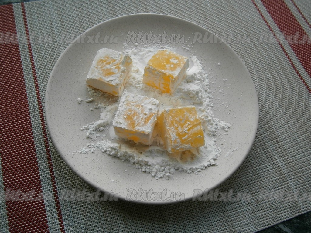 Каждый кубик обвалять в кукурузном крахмале и оставить на 1-1,5 часа для заветривания.
