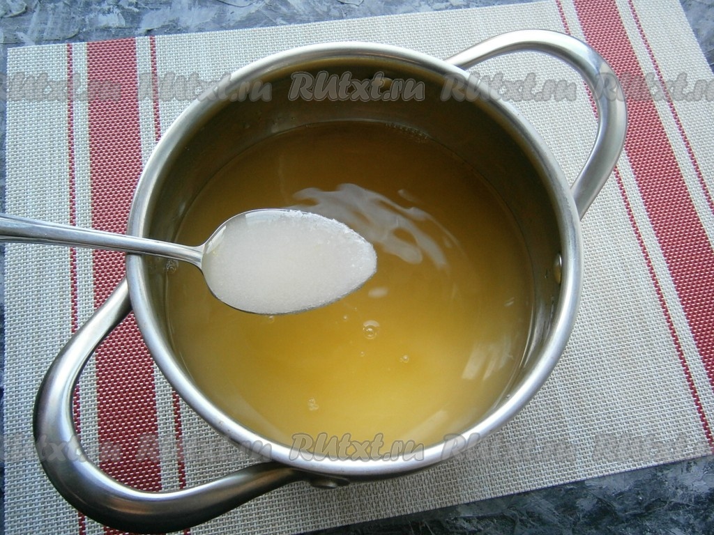 В кастрюлю с толстыми стенками и дном влить апельсиновый сок, добавить воду, всыпать сахар.