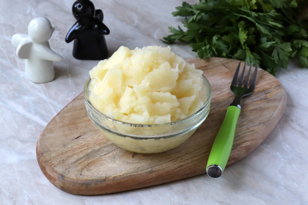 Снова перемешать толкушкой. Продолжайте перемешивать и разминать картошку толкушкой до тех пор, пока пюре не станет однородным, без комочков