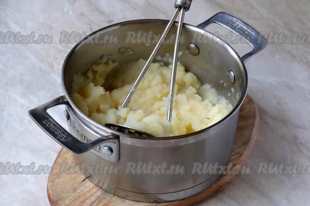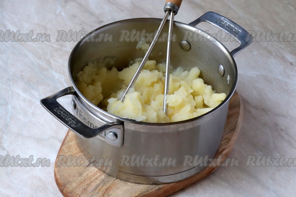С готового картофеля слить воду и переложить в другую кастрюлю, чтобы не повредить чашу мультиварки. Размять горячий картофель толкушкой.