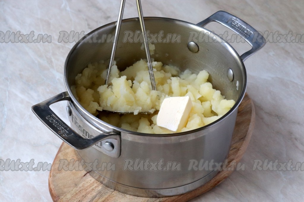 К размятому картофелю добавить сливочное масло и горячее кипячёное молоко.