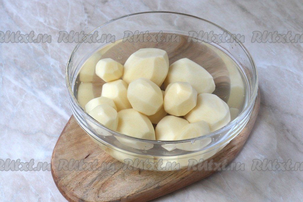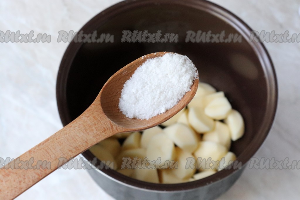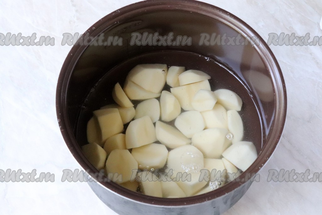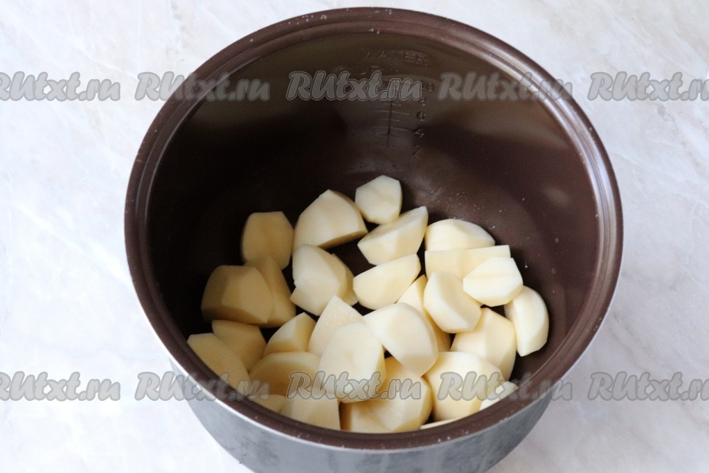 Очищенный картофель (крупные клубни лучше разрезать на части) выложить в чашу мультиварки.