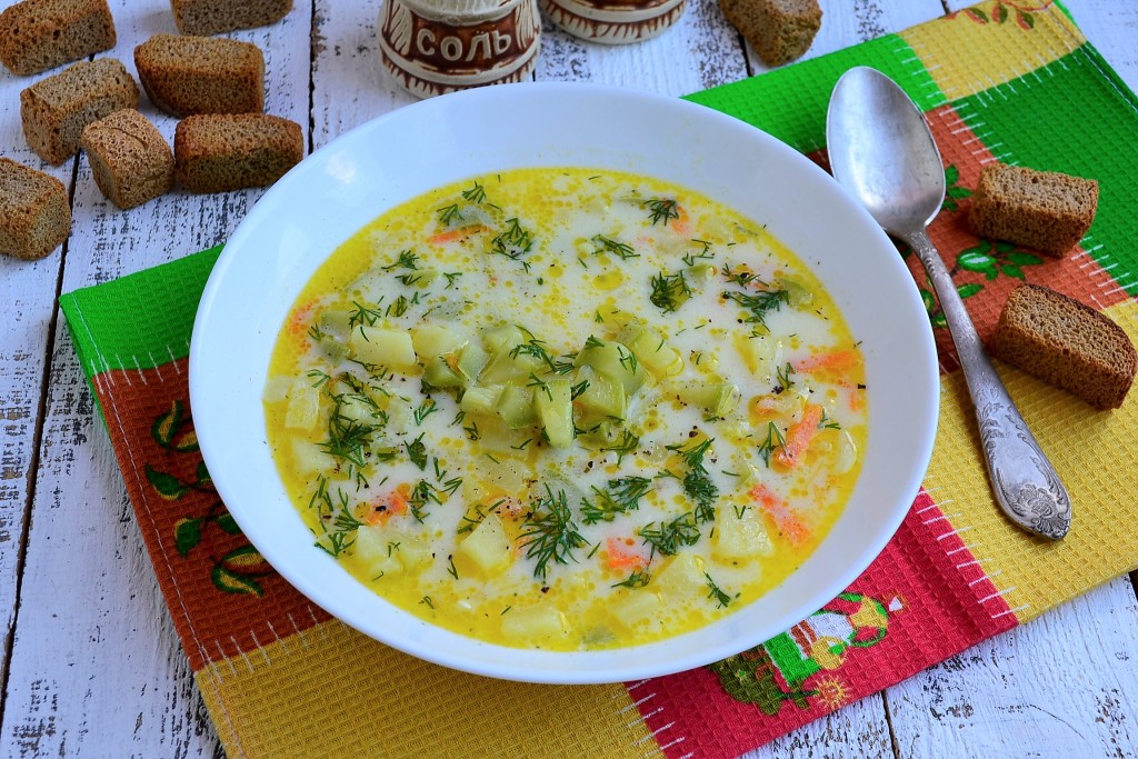 Предлагаю приготовить лёгкий, но в тоже время сытный суп из кабачков с плавленным сыром. Этот суп получается достаточно сытным, поэтому я варила его на воде, но можно в качестве основы использовать и мясной бульон. Для того чтобы не испортить вкус и внешний вид супа, обязательное условие - выбрать качественный плавленный сыр, желательно, мягкий, сливочный. Обязательно сварите этот наивкуснейший суп для себя и своих близких, разочароваться невозможно!