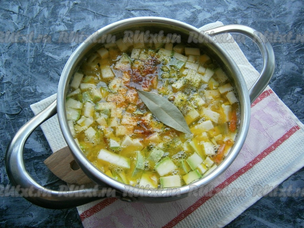 После того как картошка проварится 15 минут (будет почти готова), отправить в кастрюлю кабачки, лавровый лист, специи, обжаренные овощи, дать закипеть. После закипания варить суп на слабом огне минут 5-7.