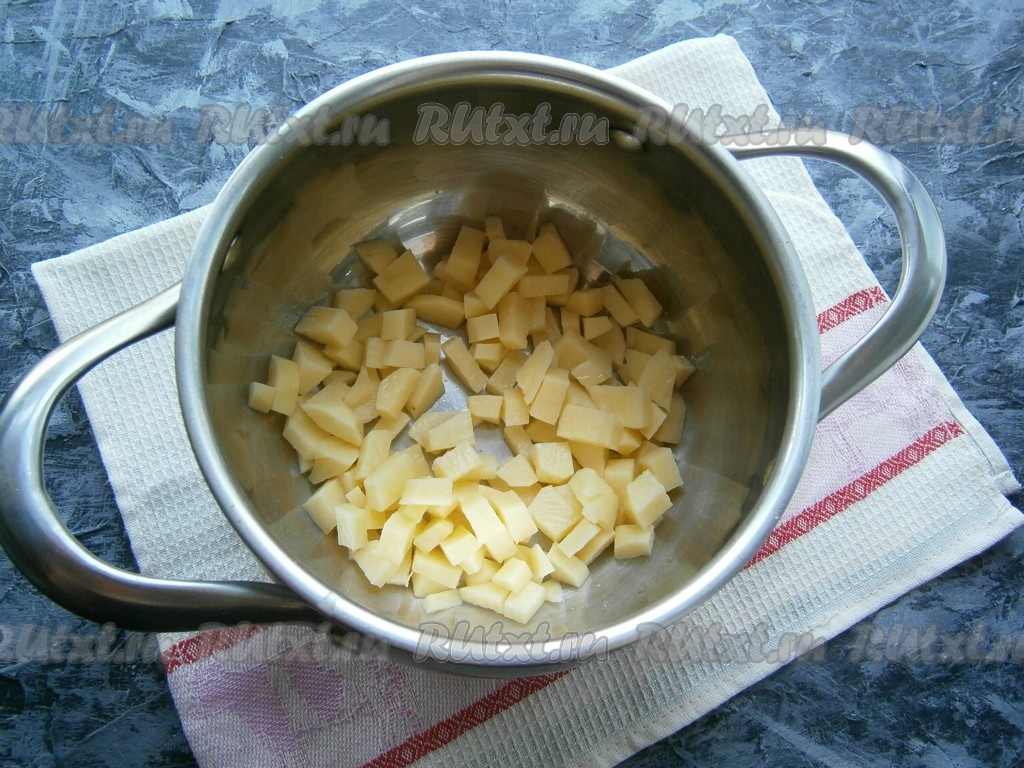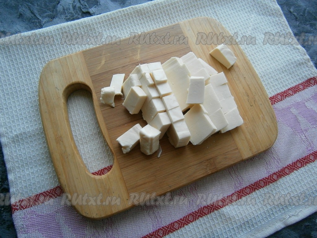 В этот раз я варила суп с плавленным сырком, его я нарезала на маленькие кубики. Можно взять и пастообразный плавленный сыр.