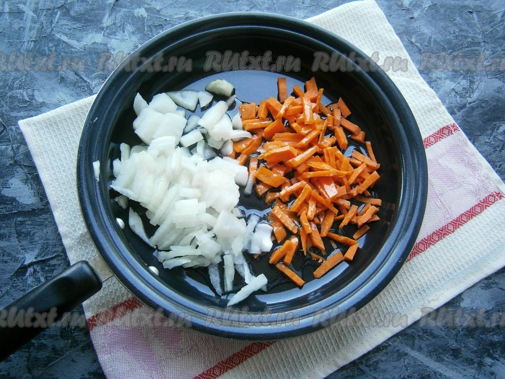 Лук нарезать достаточно мелко, морковь - тонкой соломкой (или брусочками), выложить овощи в сковороду, в которой уже прогрелось растительное масло.
