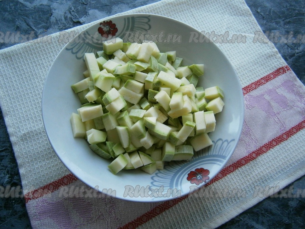 Если у кабачка толстая кожура её нужно срезать, тонкую кожуру можно оставить. Если у кабачка крупные семечки, их нужно будет удалить, мелкие семечки можно оставить. 200 грамм подготовленного кабачка нарезать на небольшие кубики.