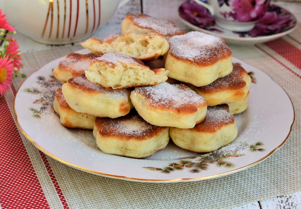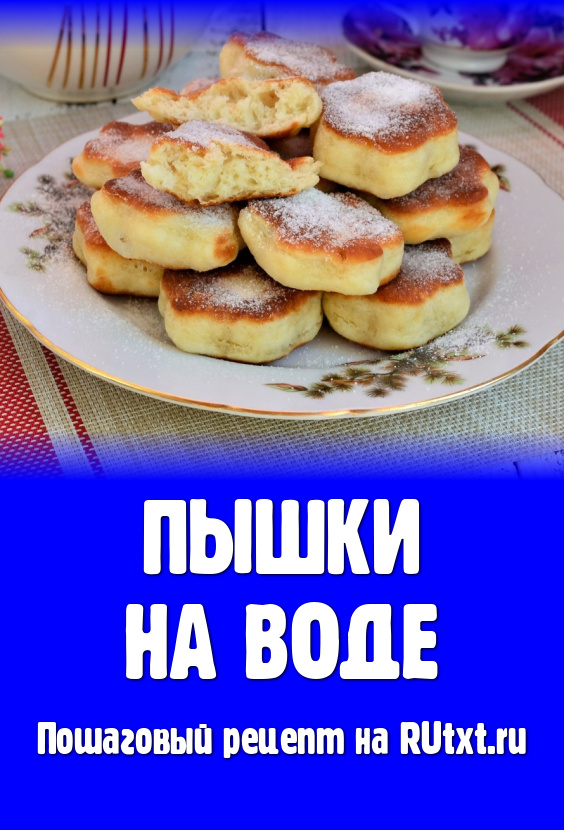 Воздушные, мягкие и очень вкусные пышки, замешанные на воде, жареные на сковороде, выложить на тарелку, дать им немного остыть и щедро посыпать сахарной пудрой. Подавать пышки можно и в тёплом, и в полностью охлаждённом виде. Очень вкусны они с чаем или молоком.