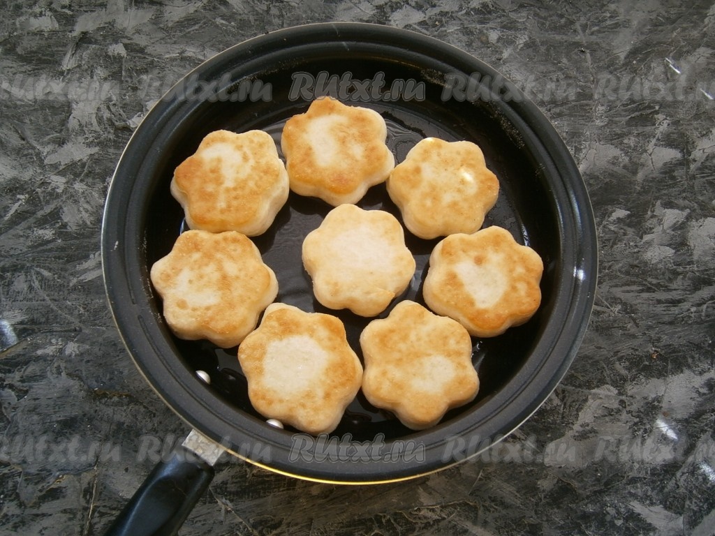 Жарить их нужно на небольшом огне до румяного цвета с одной стороны, затем перевернуть и также жарить до румяности другой стороны.
