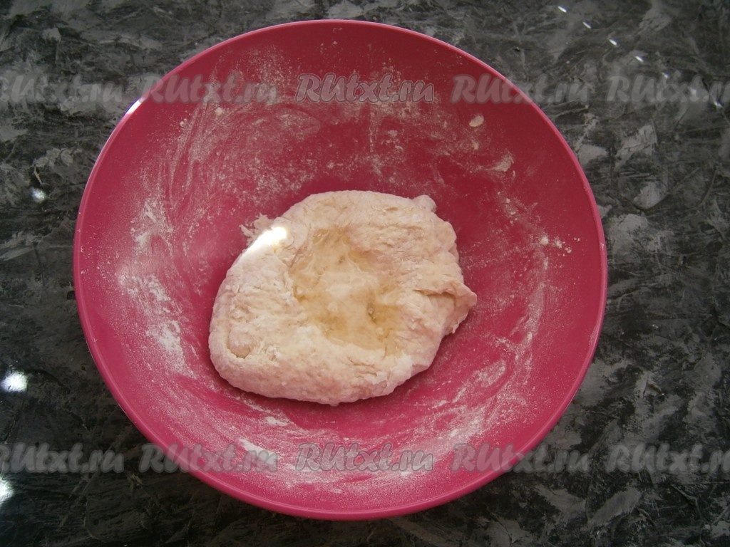 А затем руками замесить плотное, практически не липнущее, но мягкое тесто. Прямо на тесто влить одну столовую ложку растительного масла.