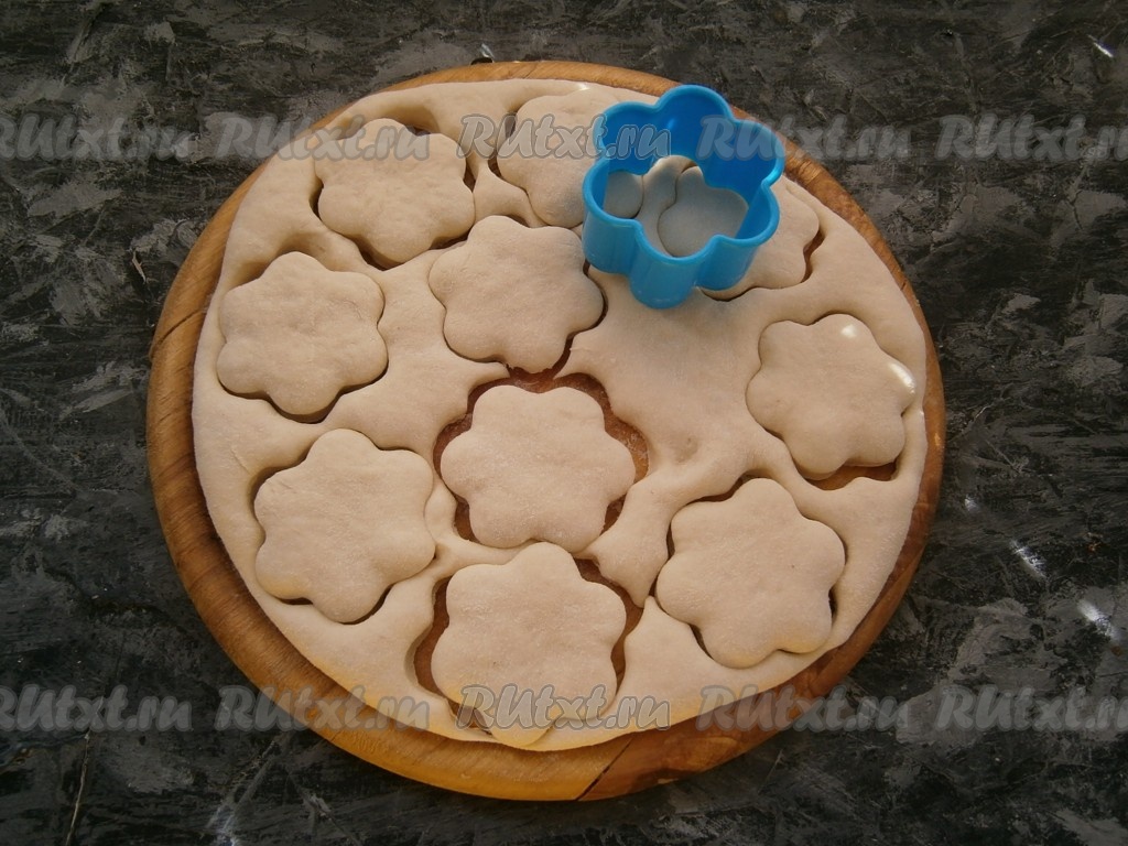 Рюмкой или формочкой вырезать из теста небольшие кружочки или фигурки.