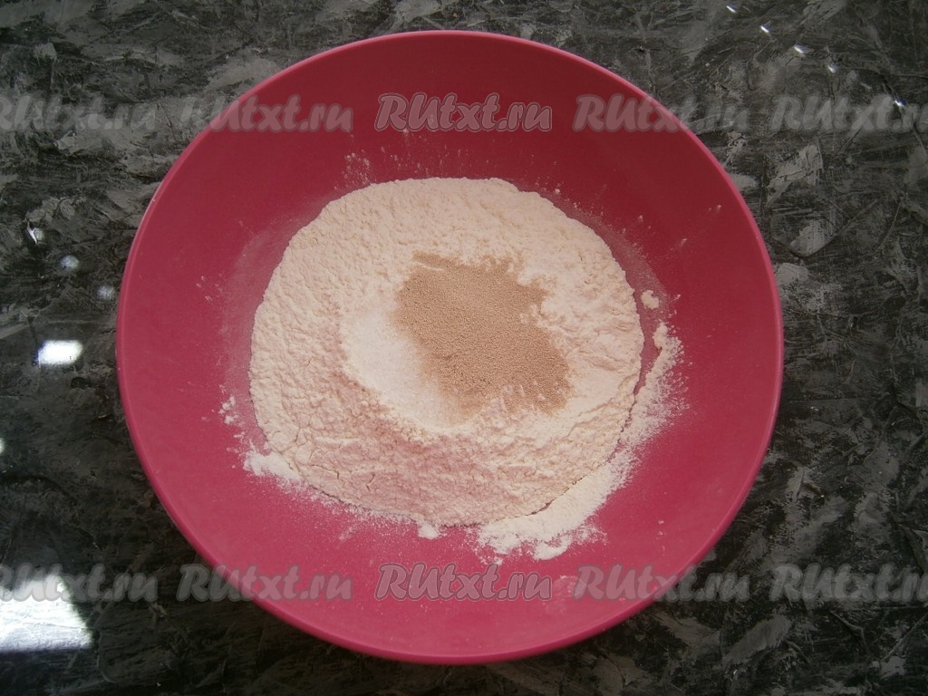 Просеять в глубокую миску муку, добавить сахар, соль и сухие дрожжи.