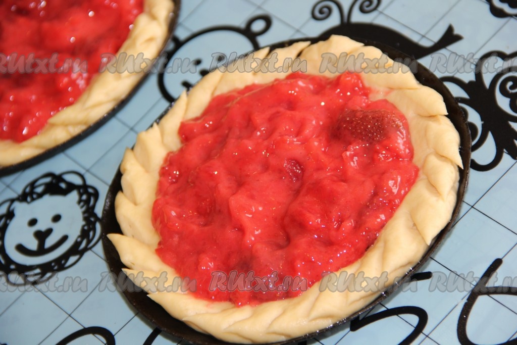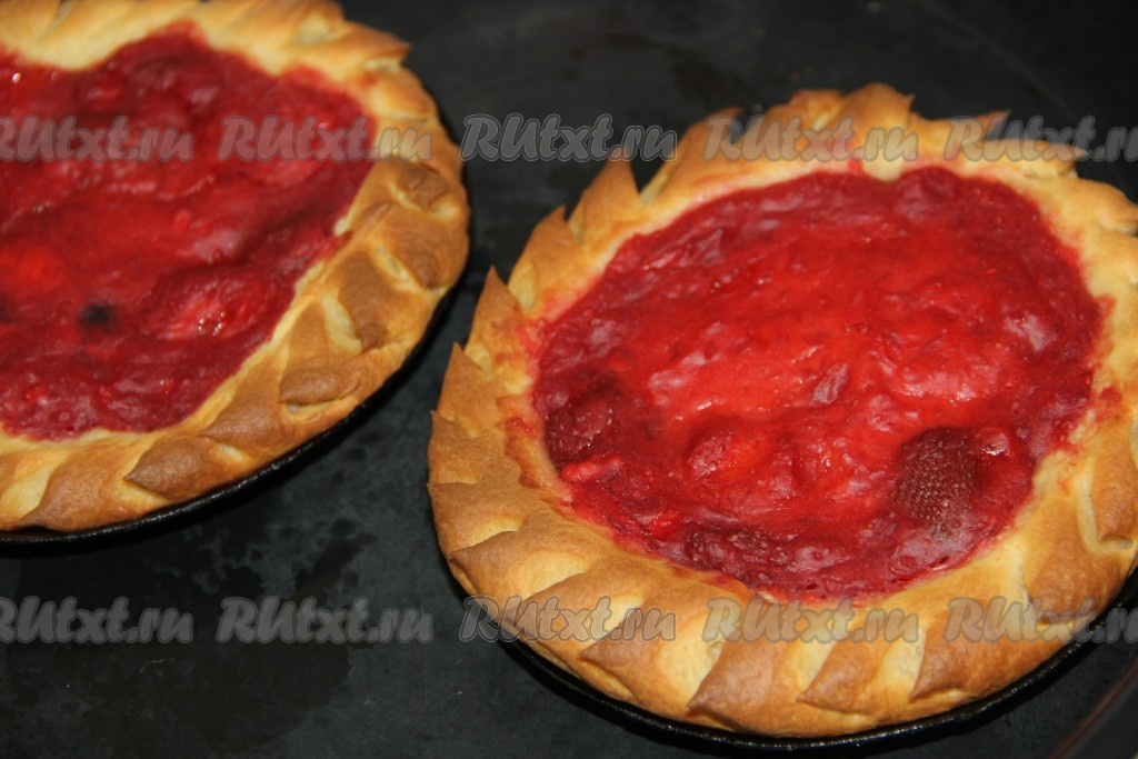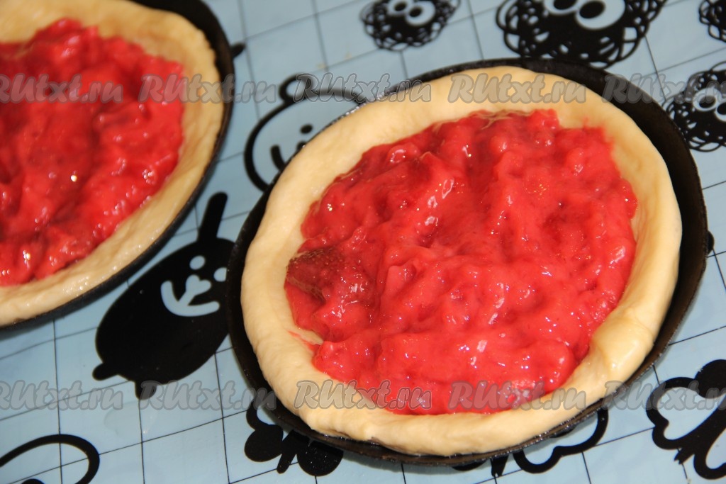 Если клубника замороженная, её нужно разморозить, а сок, образовавшийся в процессе размораживания (примерно, 150-200 мл), вылить в кастрюлю, всыпать сахар. Если готовите ватрушки со свежей клубникой, тогда налейте в кастрюлю 150-200 мл воды (можно заменить на любой фруктовый или ягодный сок), а затем всыпьте сахар. Поставить кастрюлю на средний огонь и довести ягодный сок (или воду) с сахаром до кипения, периодически помешивая. В отдельной ёмкости крахмал соединить с 200 мл холодной воды, перемешать до однородного состояния. Огонь убавить до минимума, влить тонкой струйкой крахмальную массу в кастрюлю с соком и сахаром, постоянно помешивая. Масса при варке начнёт загустевать. В кастрюлю с крахмальной массой добавить ягоды клубники, перемешать, довести массу до кипения и снять с огня. Остудить начинку (я начинку сделала накануне приготовления ватрушек). Выложить на середину каждой ватрушки начинку. У меня получилось 7 ватрушек диаметром 10-11 см.