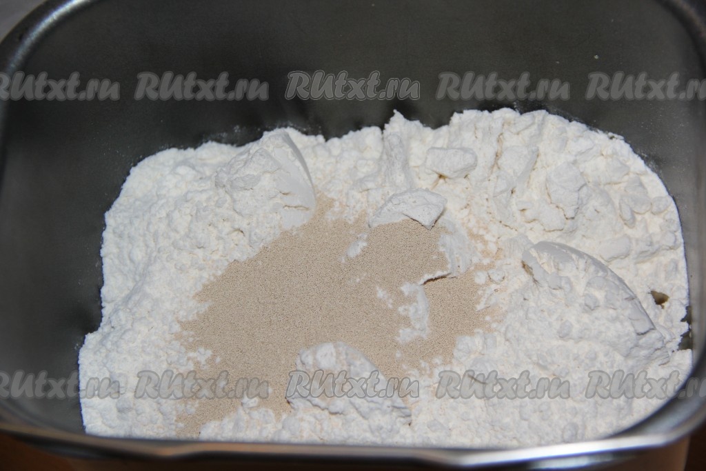 Всыпать муку, соль и дрожжи. Выставить режим "Замес теста" на 1,5 часа.