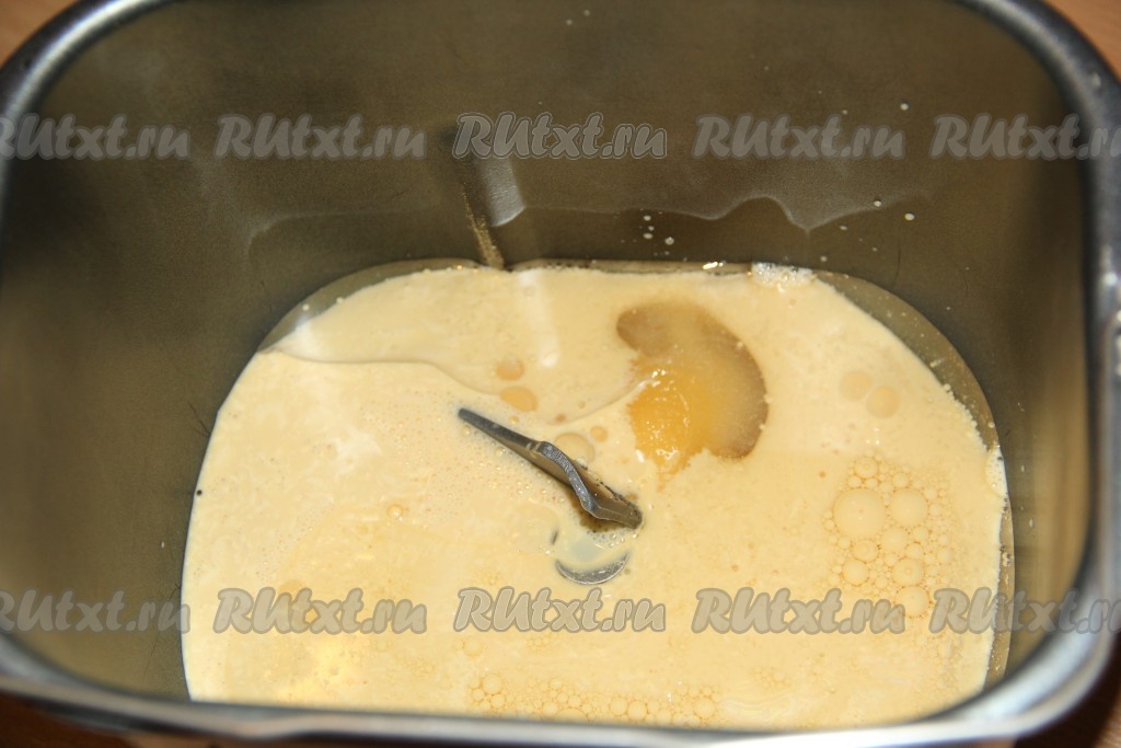 Для того чтобы замесить тесто в хлебопечке, нужно влить в ведёрко хлебопечки ряженку (или кефир) комнатной температуры, добавить растительное масло и яйцо, всыпать сахар.