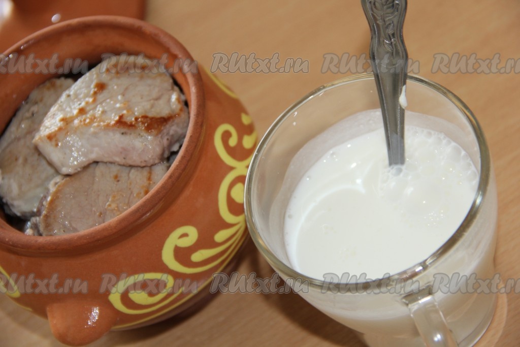 Соединить сметану с 50 миллилитрами воды, перемешать, посолить по вкусу и влить в горшочек. Сметанный соус должен полностью покрывать мясо, если нужно, влейте ещё немного воды. Закрыть горшочек крышкой (если нет крышки, можно закрыть фольгой). Поставить горшочек в холодную духовку, выставить таймер на 1 час и температуру 180 градусов.