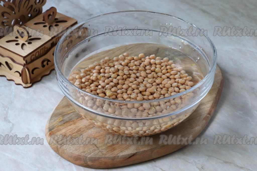 Нут, как и все сушеные сорта гороха, следует заранее замачивать в воде. Выложить его в подходящую миску и полностью залить водой комнатной температуры. Оставить минимум на 4 часа, а лучше всего на ночь.
