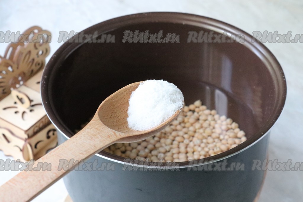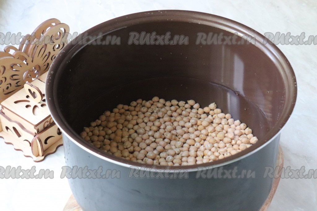 После чего воду слить, а нут тщательно промыть и выложить в чашу мультиварки. Залить 2,5 литрами горячей воды (нут заливается именно горячей водой для того, чтобы техника не тратила время на подогрев).