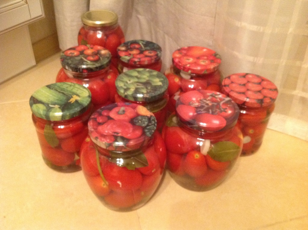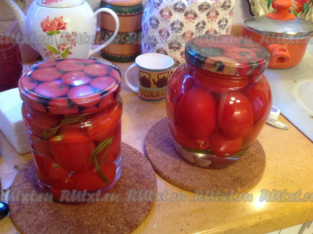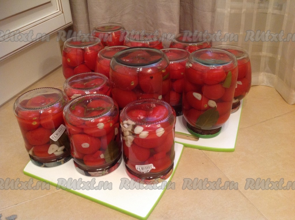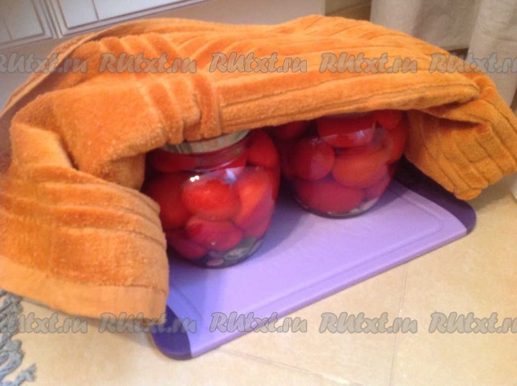 На следующий день снимаем утеплитель и переворачиваем наши баночки с маринованными помидорами. Можно убирать их на хранение!