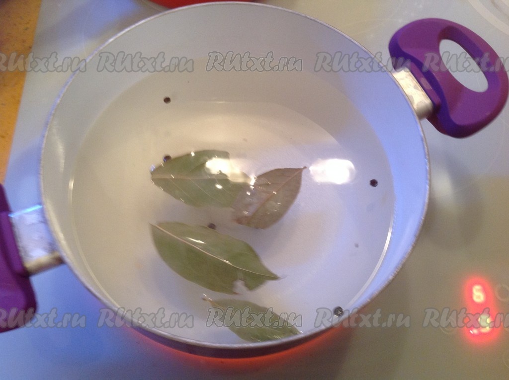 По истечении времени сливаем воду из банок в кастрюлю и готовим маринад, для этого в кастрюлю добавляем соль, сахар, перчик горошком и лавровые листья. Доводим до кипения и варим 2-3 минуты, помешивая (до полного растворения соли и сахара). Затем добавляем уксус и выключаем огонь.