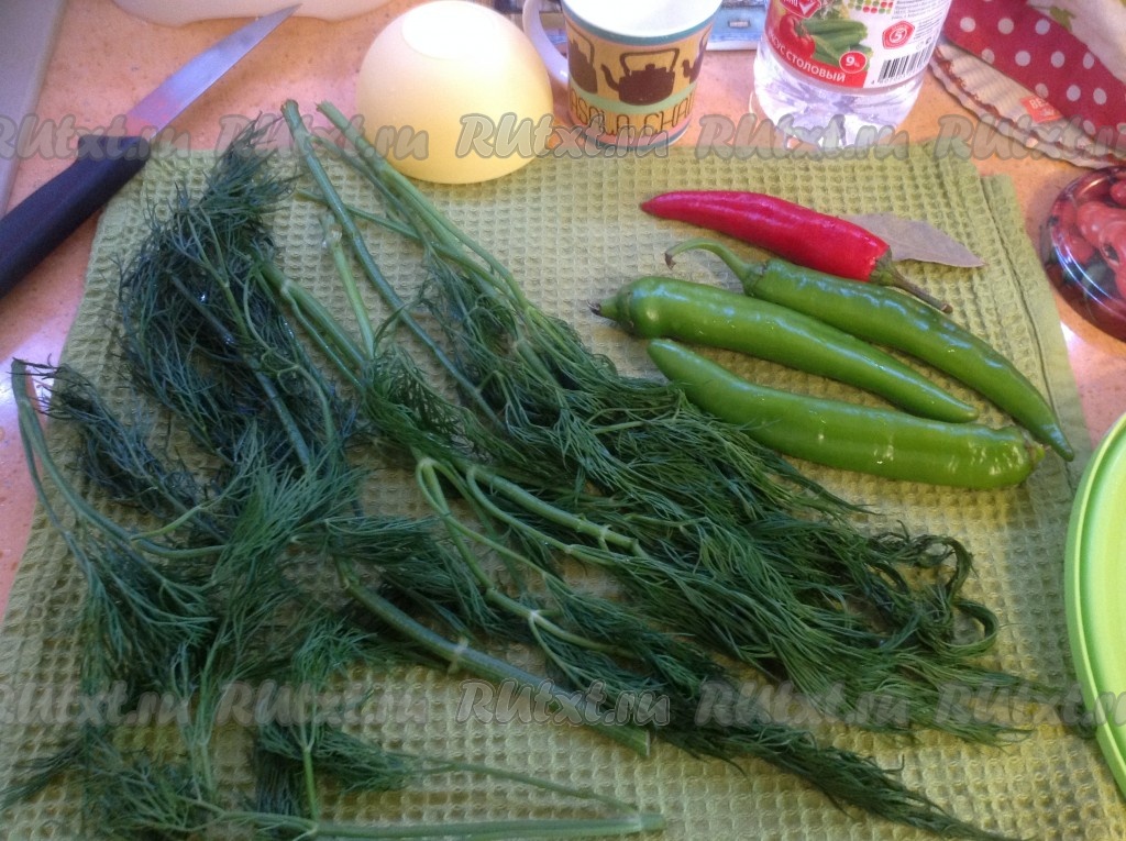 Подготовим укроп, острый перчик, очистим чеснок.