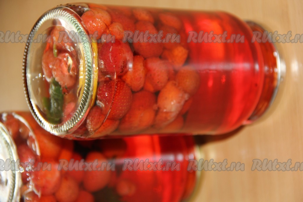Банки с клубникой полностью заполнить горячим сиропом, закрутить крышками и перевернуть. Укутать баночки с компотом в одеяло, оставить до полного остывания, а затем убрать на хранение.