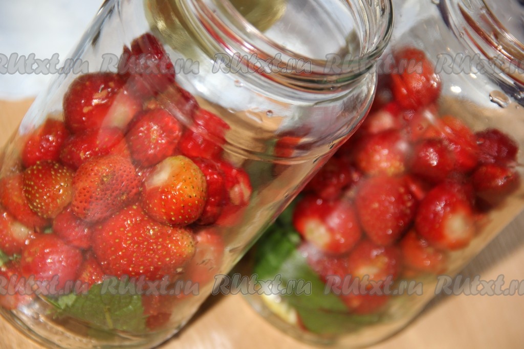 Вскипятить воду и полностью залить банки с клубникой, лимоном и мятой крутым кипятком. Накрыть баночки предварительно прокипячёнными крышками и оставить на 30 минут.