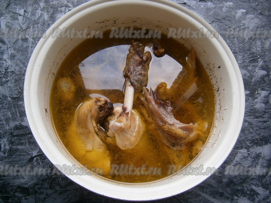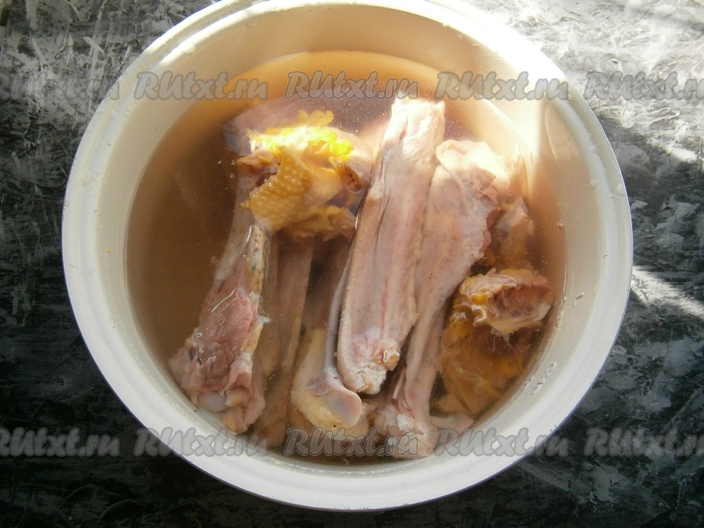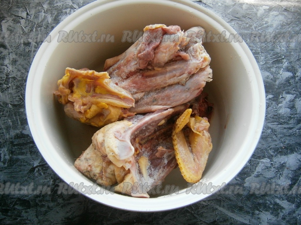 Любые части домашней птицы хорошо вымыть (если заморожены, то предварительно разморозить), поместить в кастрюлю.