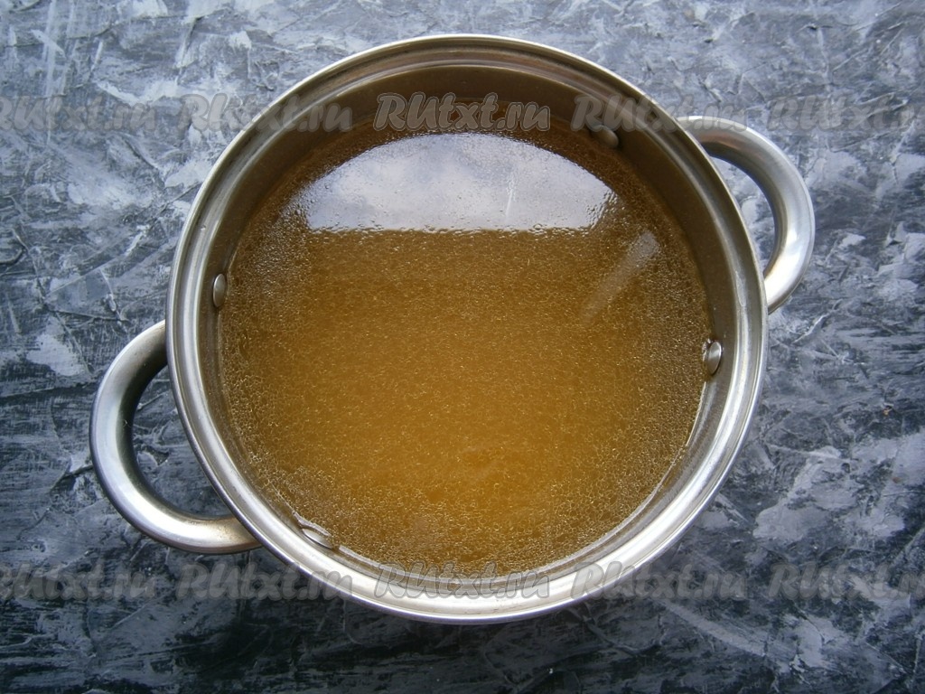Весь жир с достаточно остывшего бульона тщательно собрать в какую-нибудь посуду (например, в баночку), а затем полностью остудить, убрать в холодильник и использовать для приготовления различных блюд. Сам бульон процедить через ситечко (или марлю) в небольшую кастрюлю. Довести бульон до кипения, газ выключить, добавить желатин. Хорошо бульон перемешать и оставить его остывать до тёплого состояния.