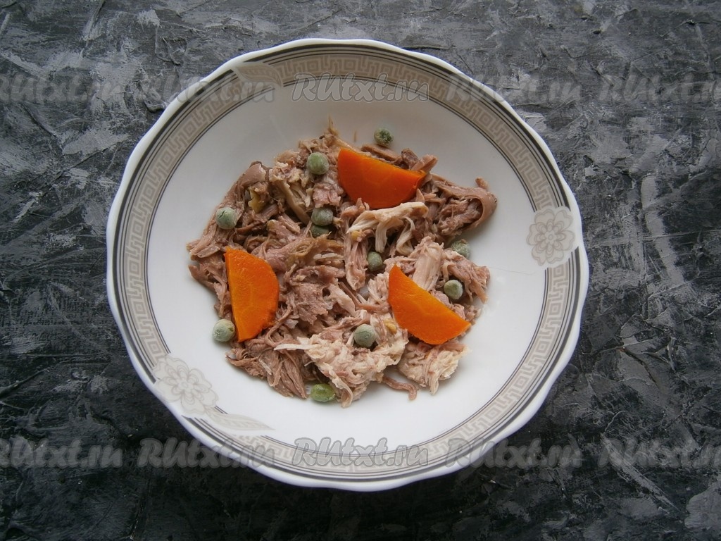 Остывшее мясо разобрать, отделив его от костей, немного измельчить. Разложить мясо по небольшим формам (или пиалам) на 1/3 объёма, добавить зелёный горошек, украсить кусочками варёной моркови. Также заливное можно готовить и в одной большой форме - это кому как удобно.