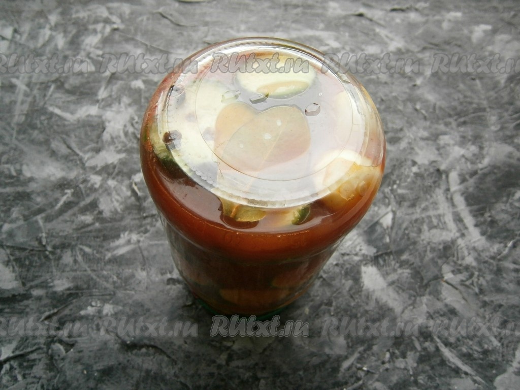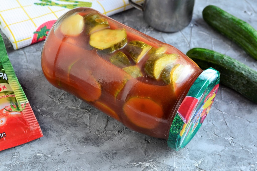 Отправить очень вкусные резаные огурцы, приготовленные с томатной пастой на зиму, под "шубу" (укутать одеялом) и оставить до полного остывания, а затем убрать на хранение.