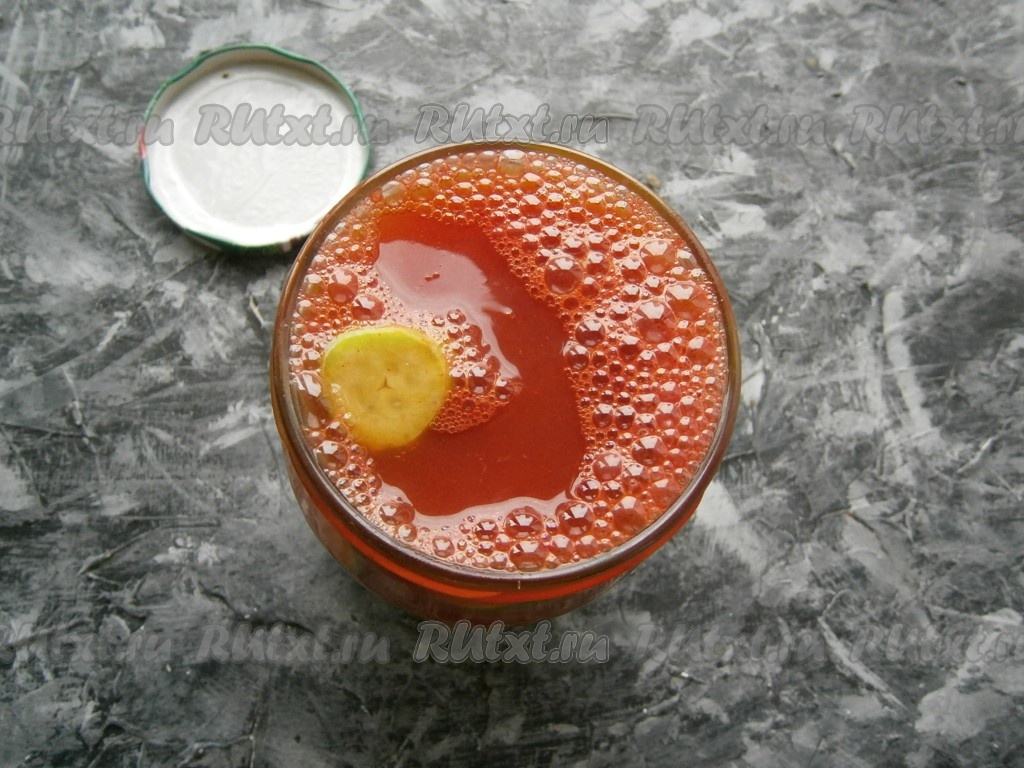 Слить воду из банки с огурцами в раковину. Сразу же залить банку с огурчиками до самого верха кипящей томатной смесью.