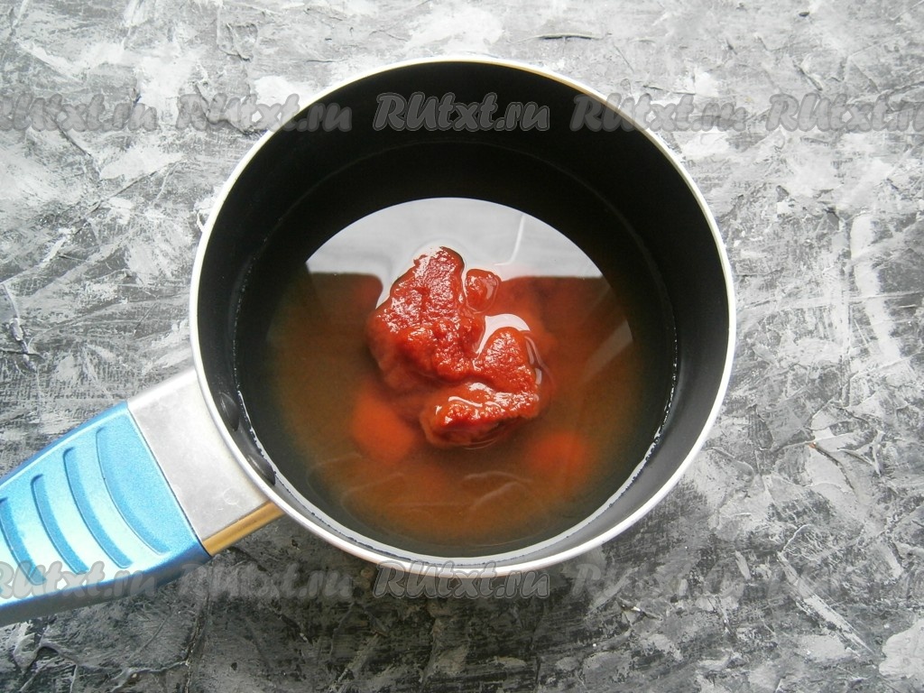 300 мл воды налить в ковшик (или кастрюльку), добавить томатную пасту, лимонную кислоту, соль, сахар, перемешать до однородности.
