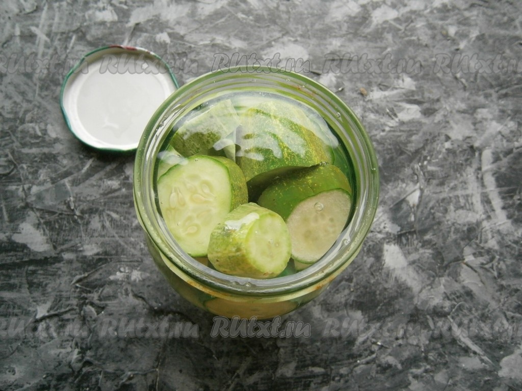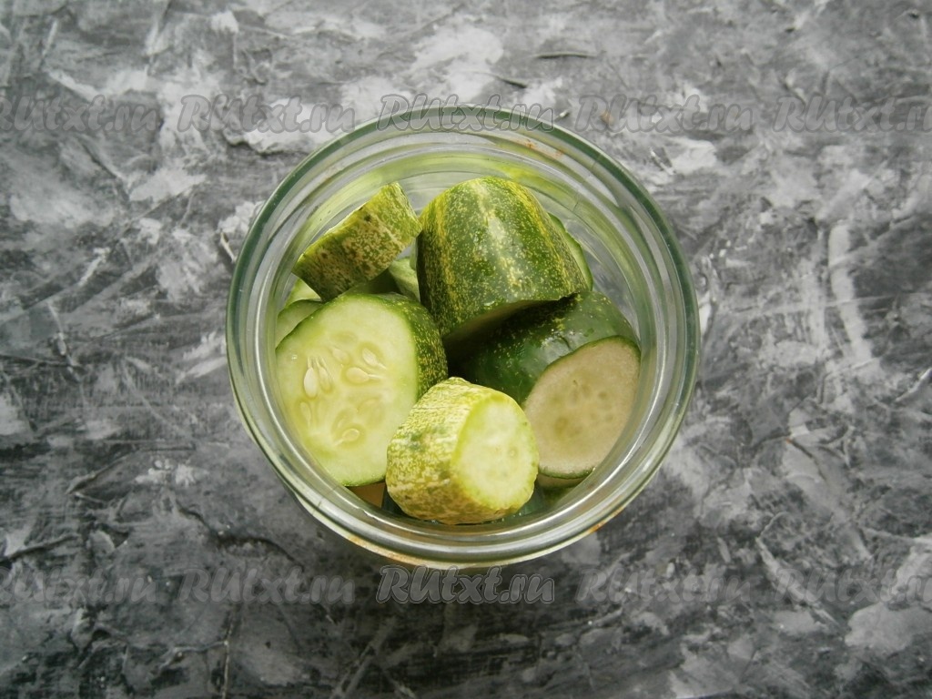 Банку наполнить огурцами, нарезанными кружочками толщиной, примерно, 2-2,5 см.