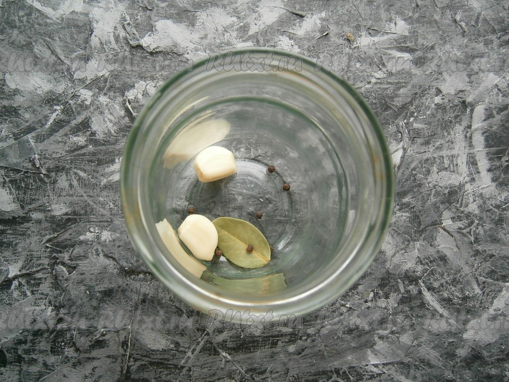 В простерилизованную сухую баночку поместить чеснок, лавровый листочек и чёрный перец горошком.