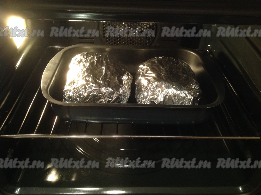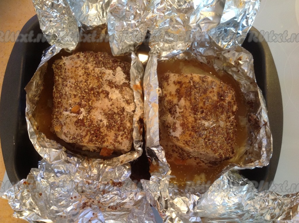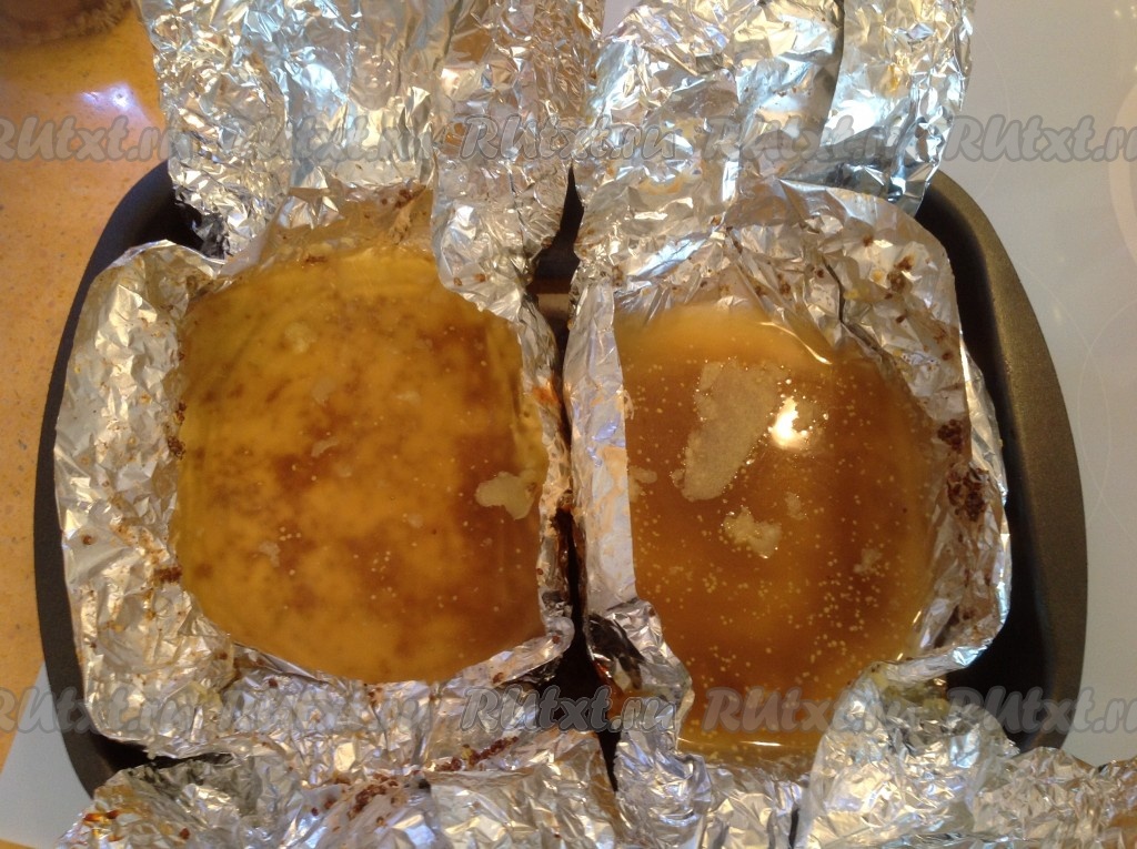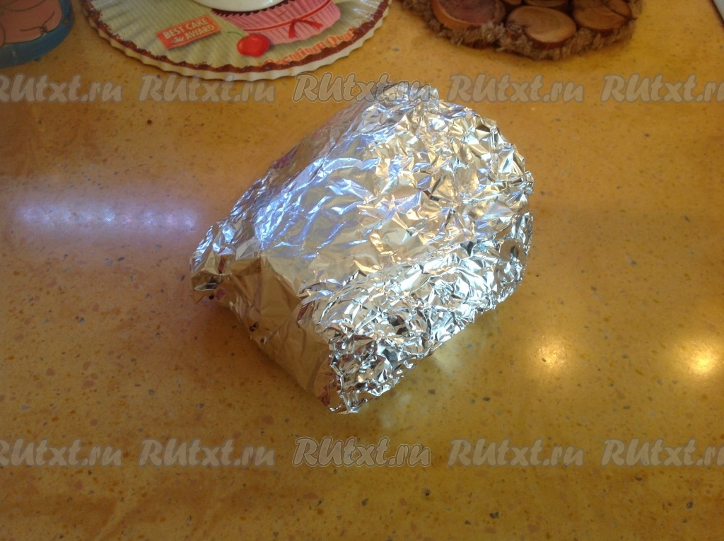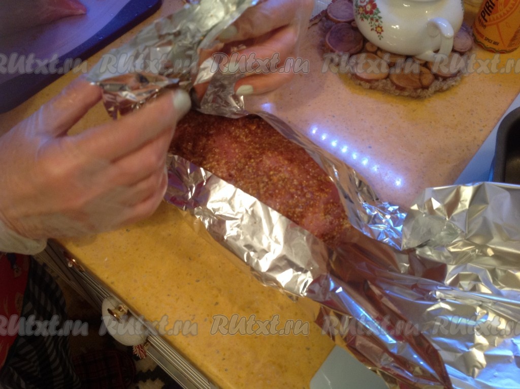 Мясо, полностью завёрнутое в фольгу, выложить на противень (или блюдо), в котором будет запекаться. Оставить на 30 минут для маринования.