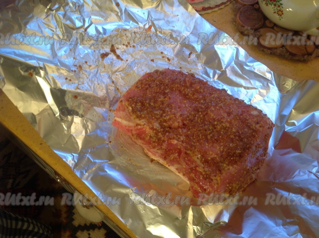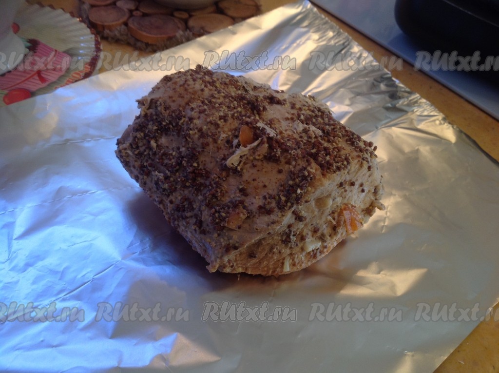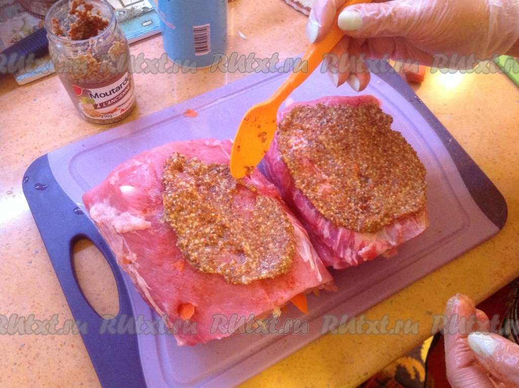 Смазать куски мяса со всех сторон зерновой горчицей.