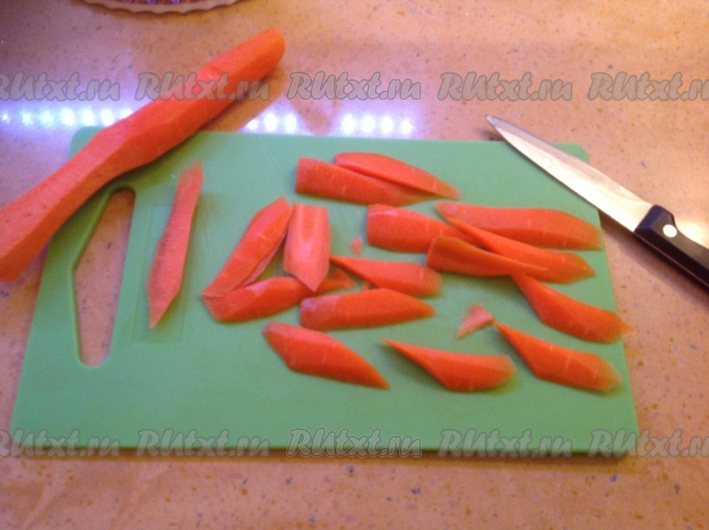 Очищенную морковку нарезать соломкой с острым краем. Очистить и нарезать чеснок таким же способом.