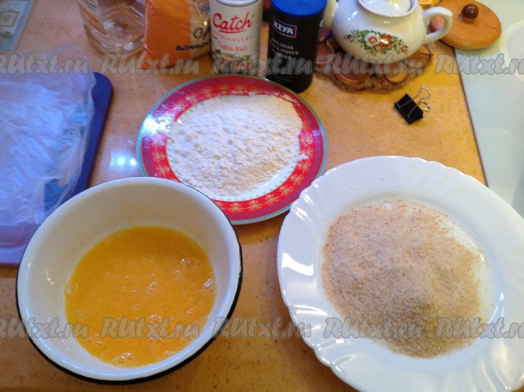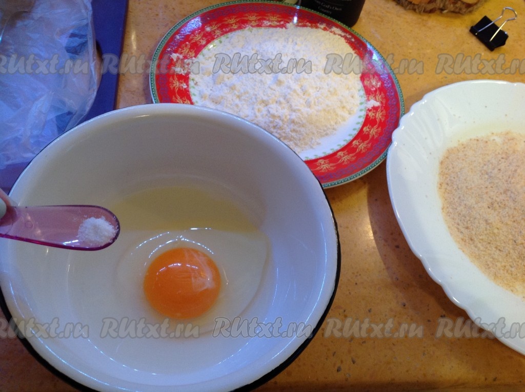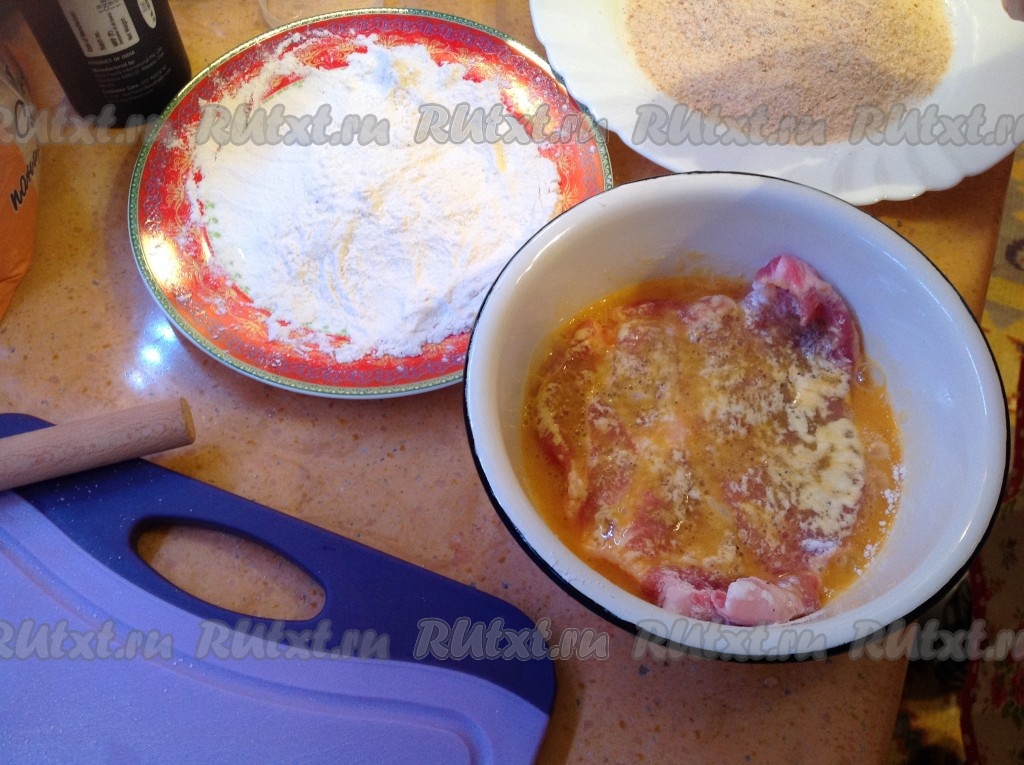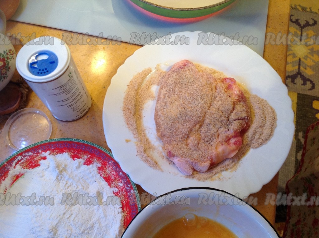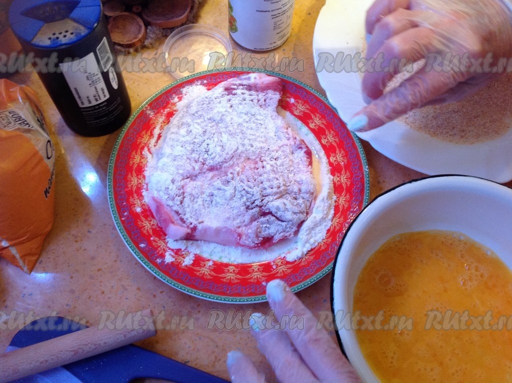 Теперь окунаем наш отбитый кусочек по очереди в муку, затем в яйцо, а после этого - в сухари.