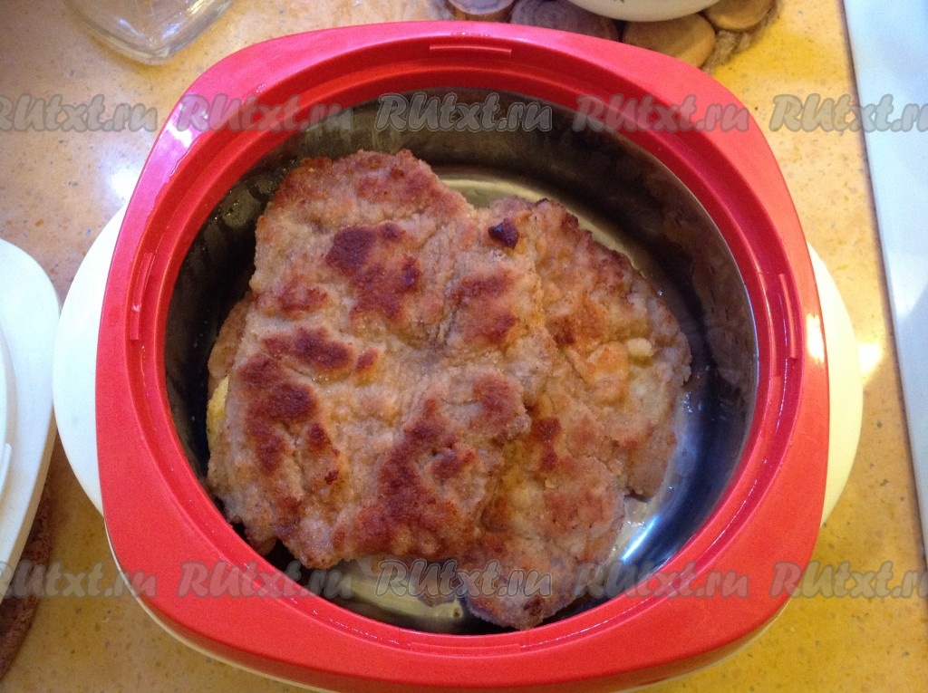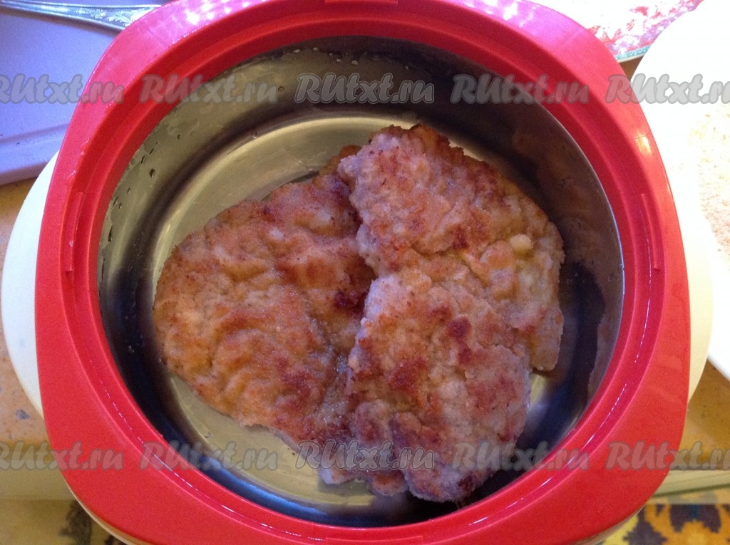 Перекладываем отбивные со сковородки в другую посуду (у меня: миска-термос) и накрываем крышкой.