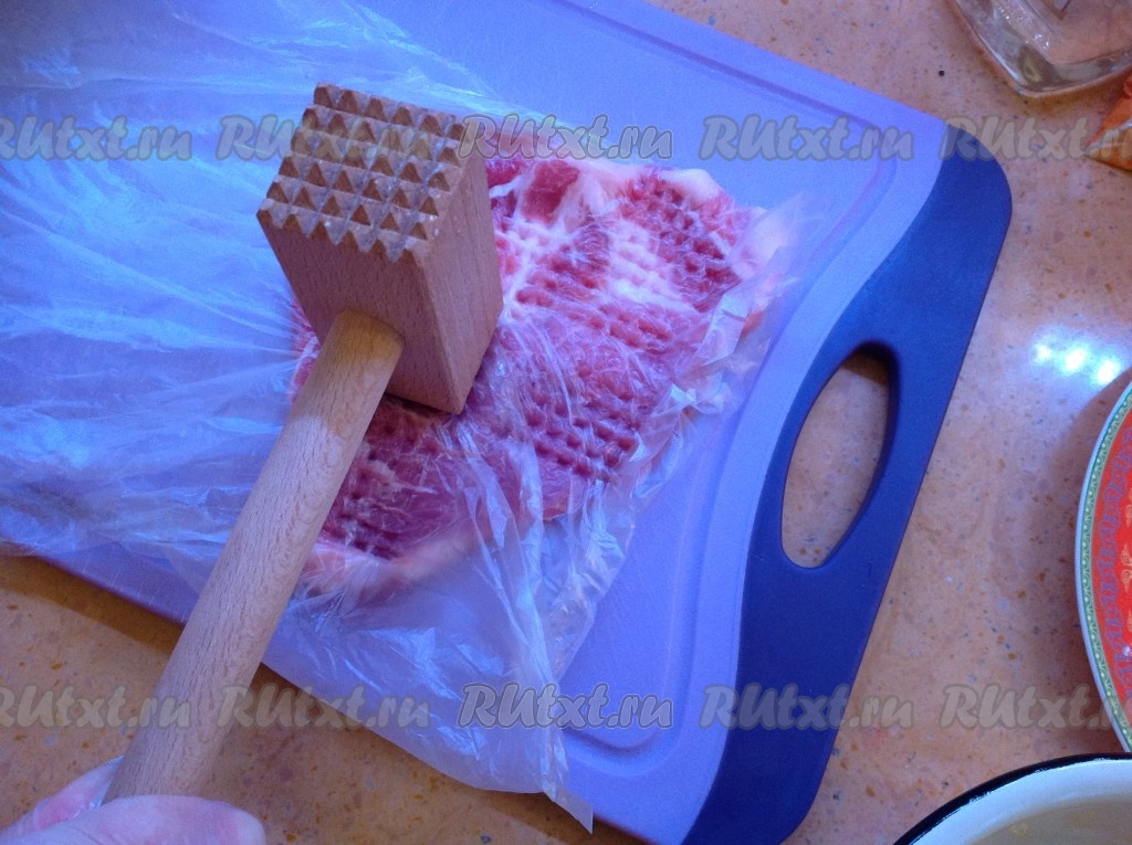 Кусочки свиной шейки промываем водой и обсушиваем бумажным полотенцем. Затем каждый кусочек кладём в пакет и отбиваем молотком для мяса с двух сторон. Можно это делать и без пакета, но я использую его, чтобы не разлетались брызги и кусочки мяса в стороны.