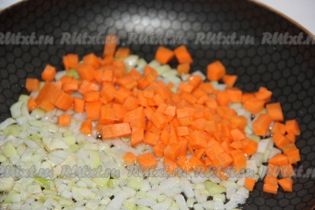 Морковь очистить, нарезать на мелкие кубики (можно натереть на тёрке) и выложить в сковороду к луку.