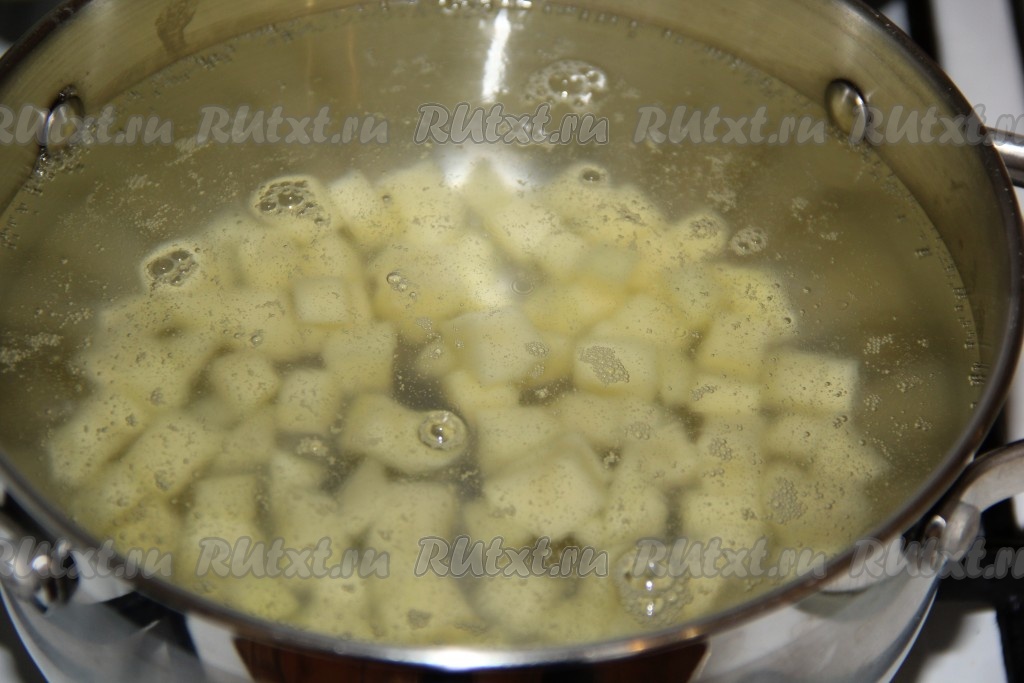 В кастрюлю влить 2,3-2,5 литра воды. Довести воду до кипения. Картофель очистить, нарезать на кубики, выложить в кастрюлю с кипящей водой, снова дать закипеть.